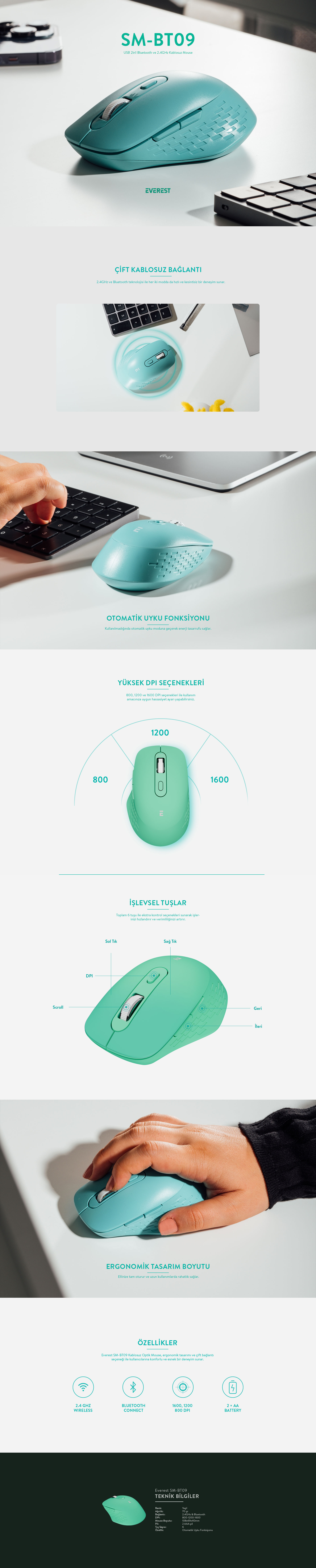 | Etiketler | Everest SM-BT09 Usb Yeşil 2in1 Bluetooth ve 2.4GHz Kablosuz Mouse |