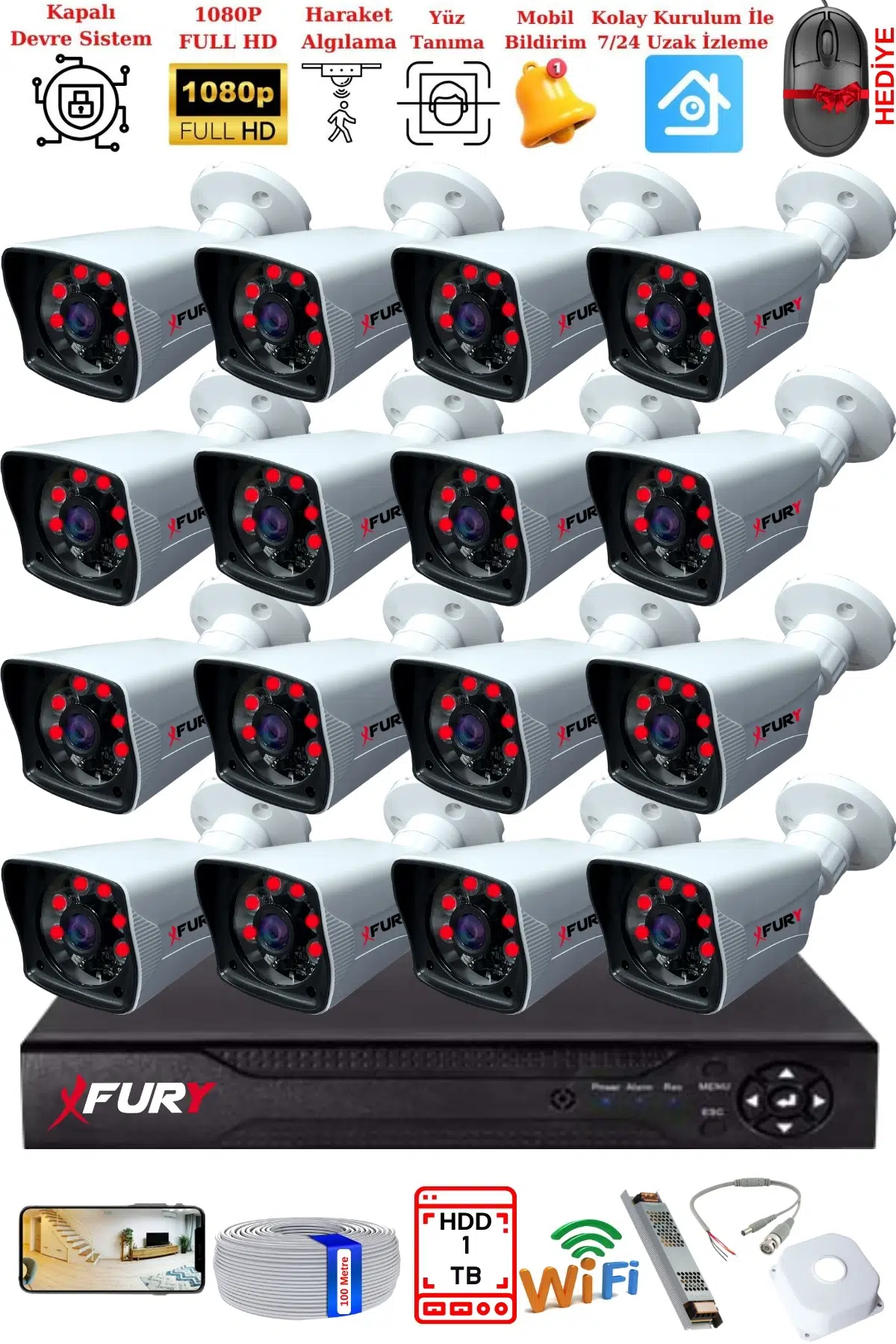 ·16 Adet FURY 5mp 3.6mm Lensli 1080P 2mp Görüntü 6 Atom Led Gece Görüşlü Full Hd Güvenlik Kamerası 5525