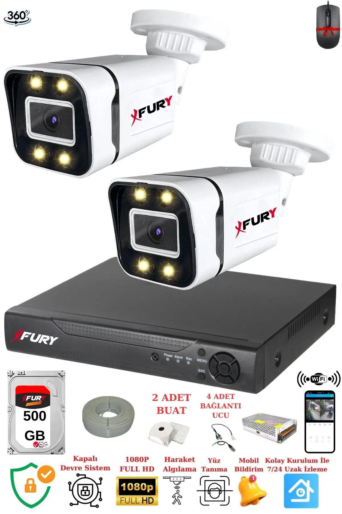 EtiketlerFURY 2 Kameralı Full Hd Gece Renkli - Su Geçirmez Ultra Led Güvenlik Kamerası Seti 500GB