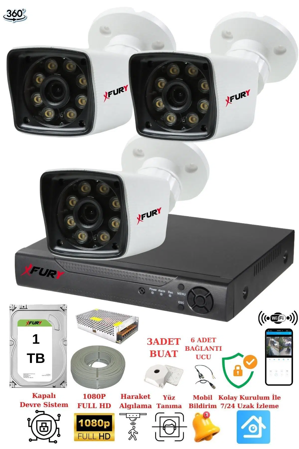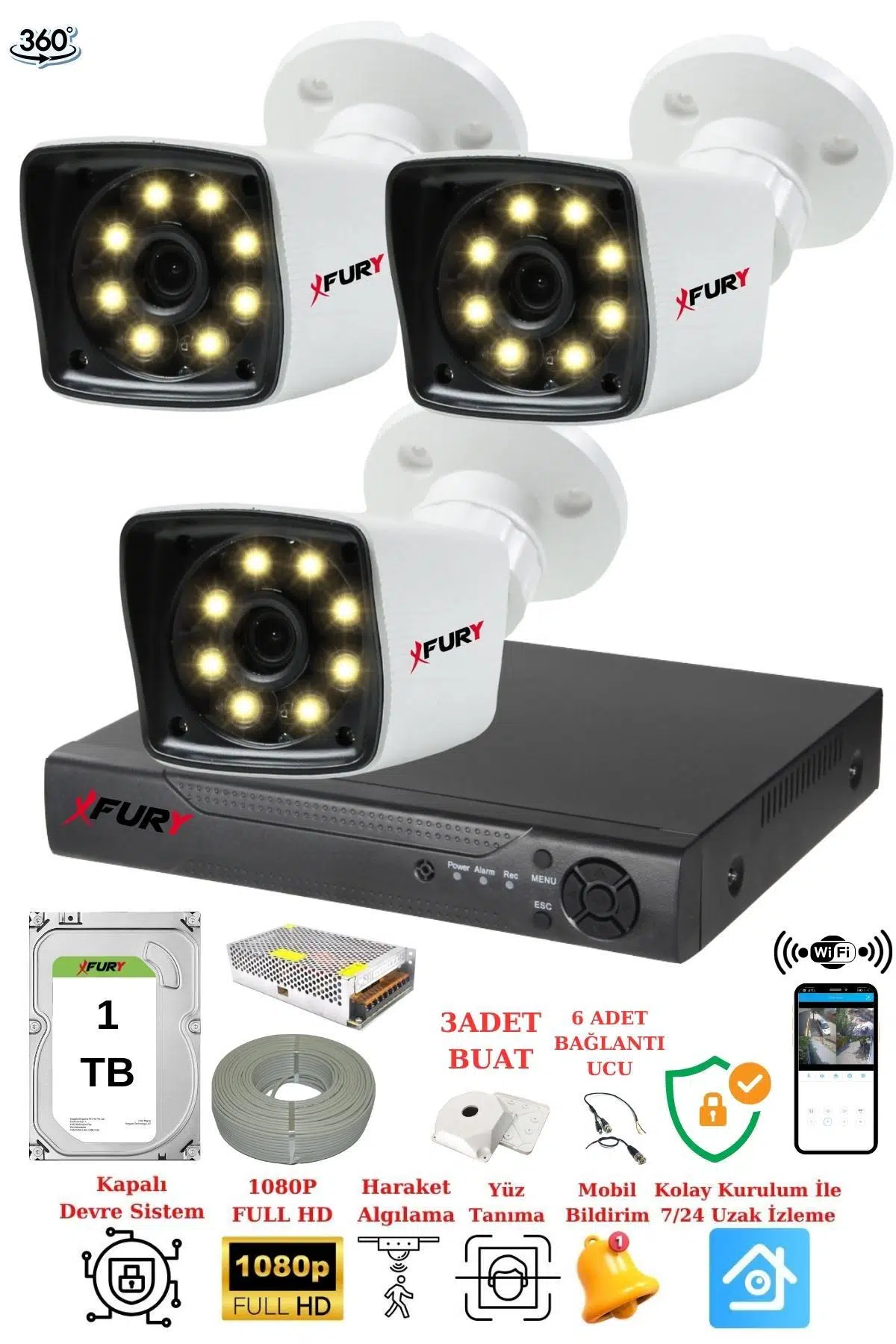 FURY 3 Kameralı 5mp Lens 1080p 2mp Color Görüntü 8 Warm Led Gece Görüş FullHd Güvenlik Kamera 5525W 1TB