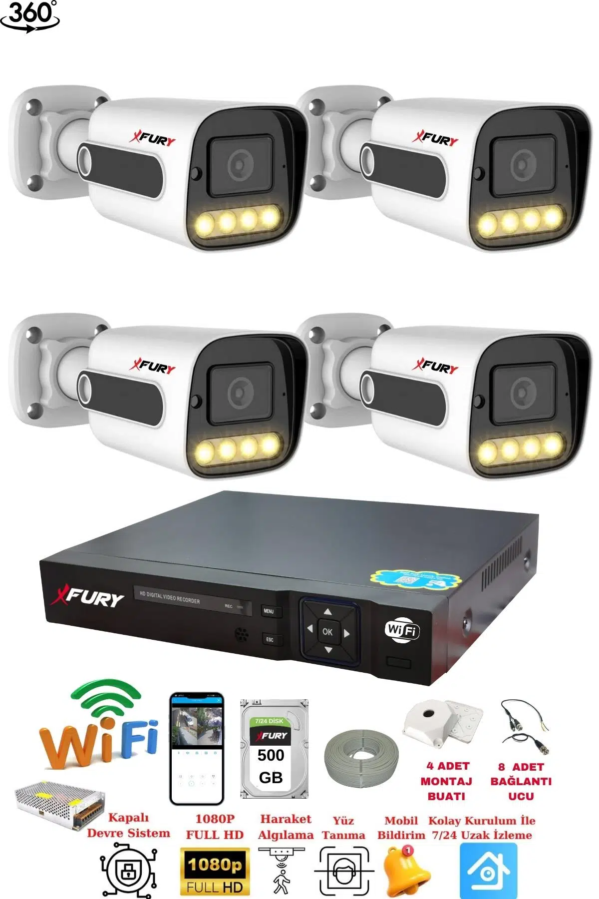 ·4 Adet FURY1080P Görüntü Gece Renkli FullHd 4xUltra Led Gece Renkli Güvenlik Kamera 5500