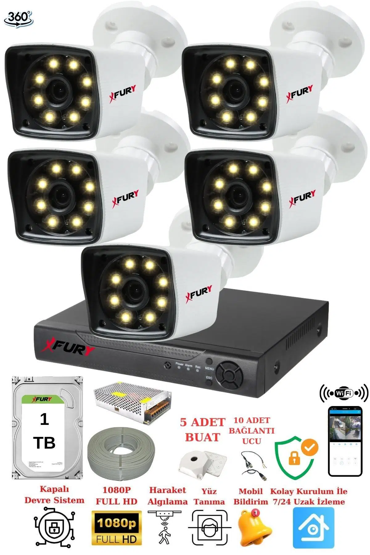 FURY 5 Kameralı 5mp Lens 1080p 2mp Color Görüntü 8 Warm Led Gece Görüş FullHd Güvenlik Kamerası 5525W 1TB