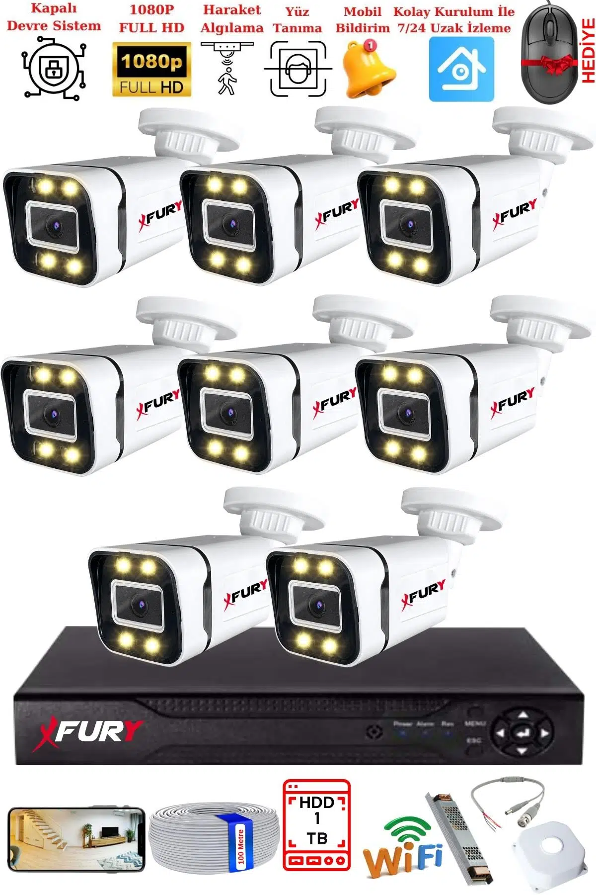 8 Adet FURY Gece Renkli - 5mp Lens 1080pFull HD Ahd Güvenlik Kamerası 4 x Ultra Led Renkli Gece Görüş 5580