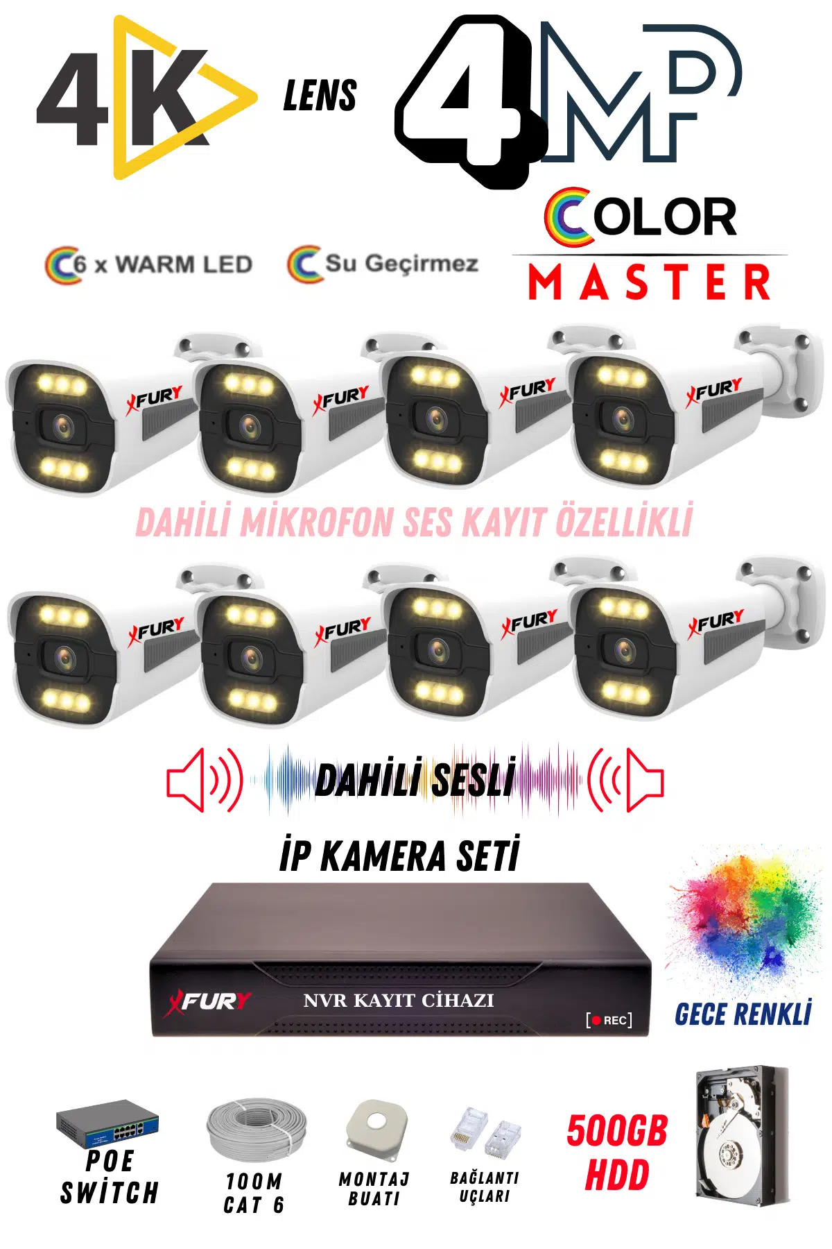 | Etiketler | FURY 8 Kameralı Sesli 4k Lens 4MP Ultra HD Ip Güvenlik Kamerası Seti Gece Renkli Su Geçirmez 1506 500GB |