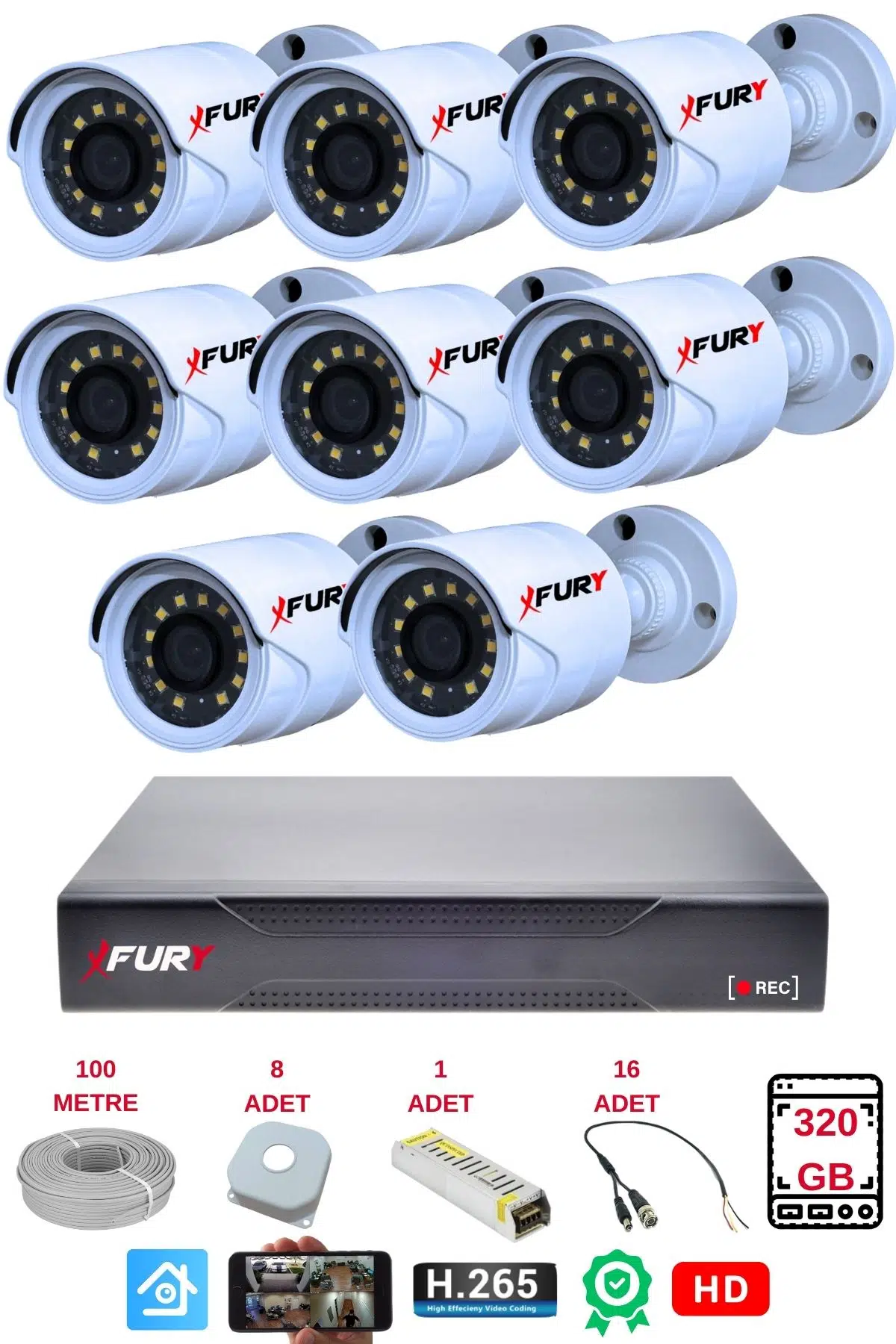 EtiketlerFURY 8 li Gece Renkli Görüş Güvenlik Kamerası Full HD-Su Geçirmez Güvenlik Kamerası Seti 320GB