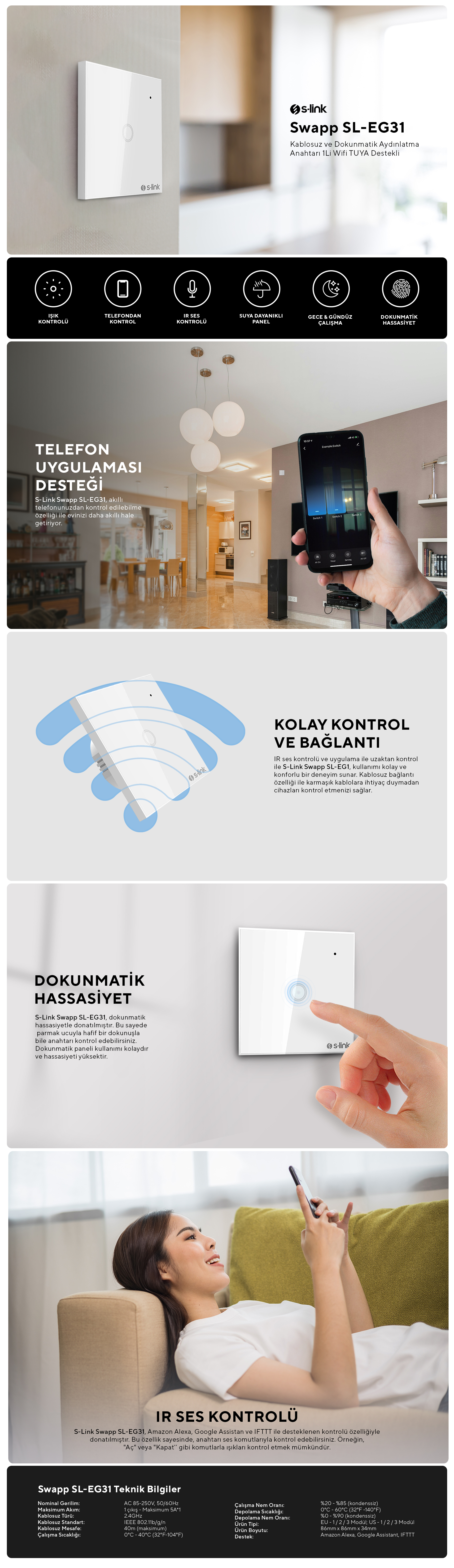 | Etiketler | S-link SL-EG31 Kablosuz ve Dokunmatik Aydınlatma Anahtarı 1'Li Wifi TUYA Destekli |
