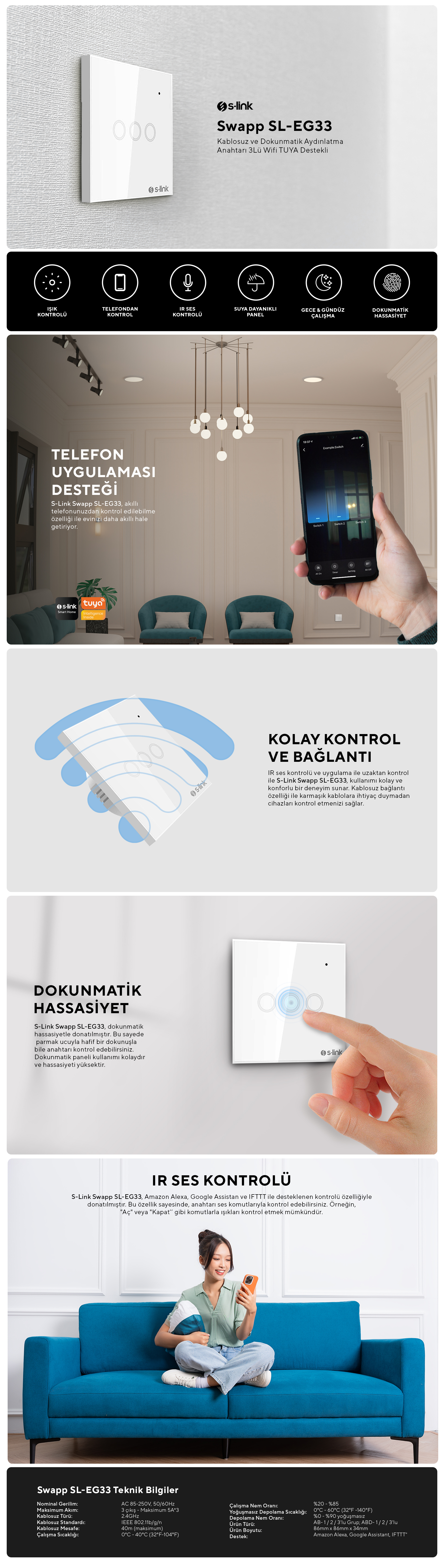 | Etiketler | S-link SL-EG33 Kablosuz ve Dokunmatik Aydınlatma Anahtarı 3'Lü Wifi TUYA Destekli |
