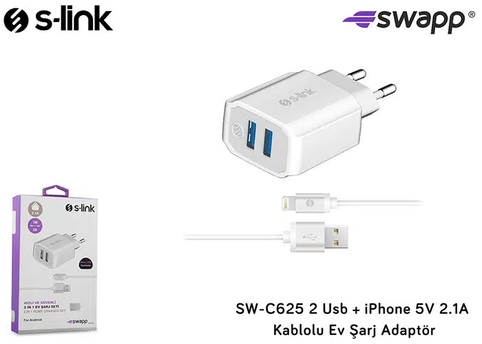 | Etiketler | S-link SW-C625 2 Usb + iPhone Lightning 5V 2.1A Kablolu Ev Şarj Adaptör |