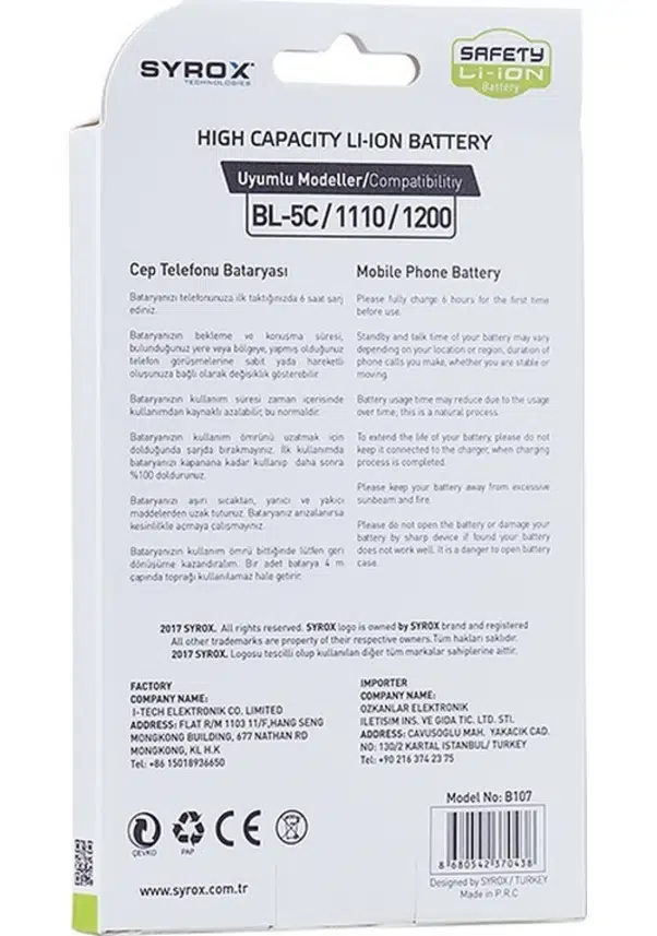 EtiketlerSyrox B107 Nokia Bl-5C/1110/1200 1020 Mah Li-İon Batarya
